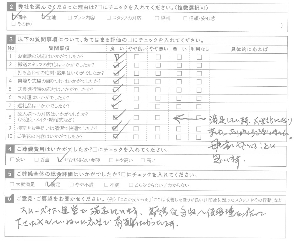 スムーズな運営で満足しています。葬儀後自宅へ仮祭壇を作って下さった方もていねいな対応で有難かったです。