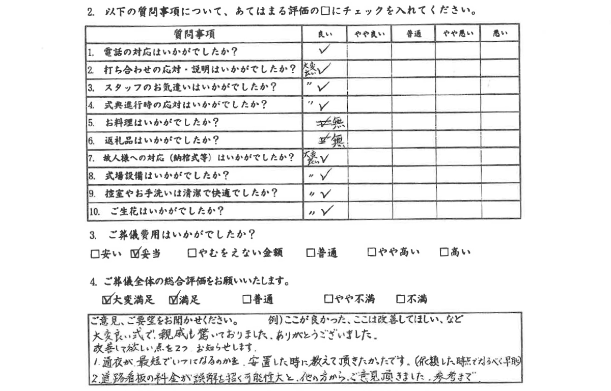 大変良い式で、親戚も驚いておりました、ありがとうございました。 改善して欲しい点を2つ、お知らせします。 1.通夜が最短でいつになるのかを、安置した時に教えて頂きたかったです。(依頼した時点でなるべく早目に) 2.道路看板の料金が誤解を招く可能性大と、他の方からご意見頂きました、参考までに
