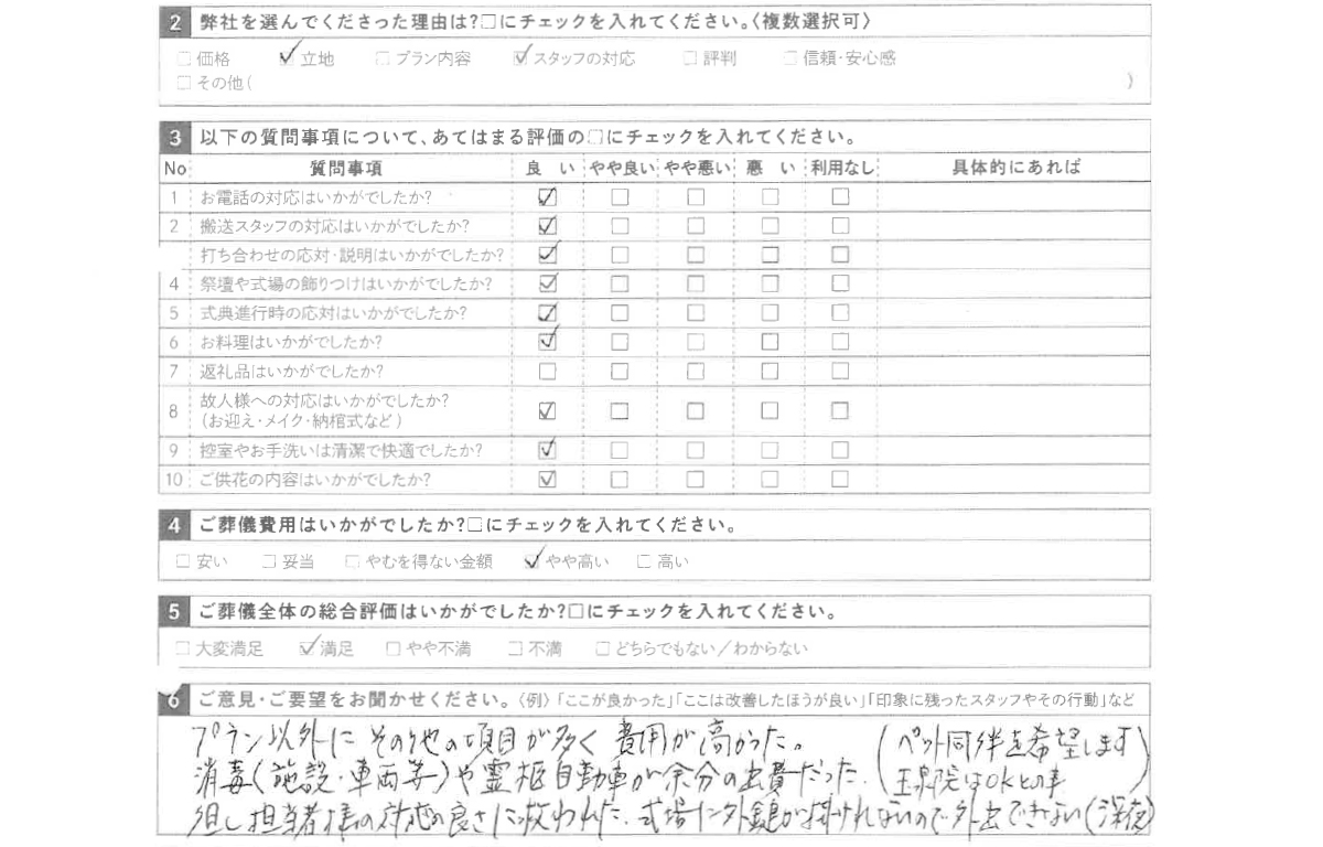 プラン以外にその他の項目が多く費用が高かった。消毒(施設、車両等)霊柩自動車が余分の出費だった。 (ペット同伴を希望します。玉泉院はOKとの事) 但し担当者様の対応の良さに救われた式場に外鍵がかけれないので外出ができない(深夜)