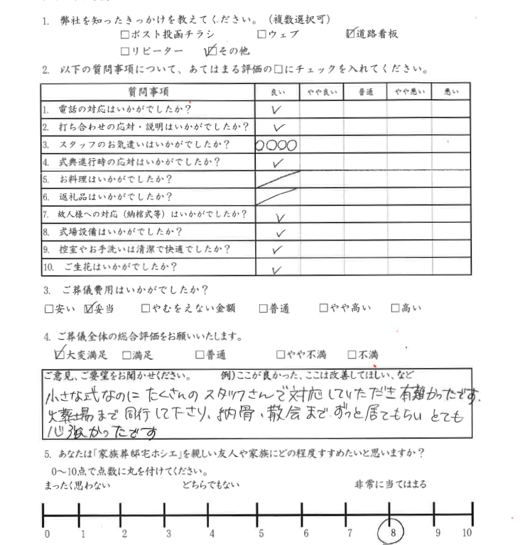 小さな式なのにたくさんのスタッフさんで対応していただき有難かったです。 火葬場まで同行して下さり、納骨・散会までずっと居てもらいとても心強かったです。
